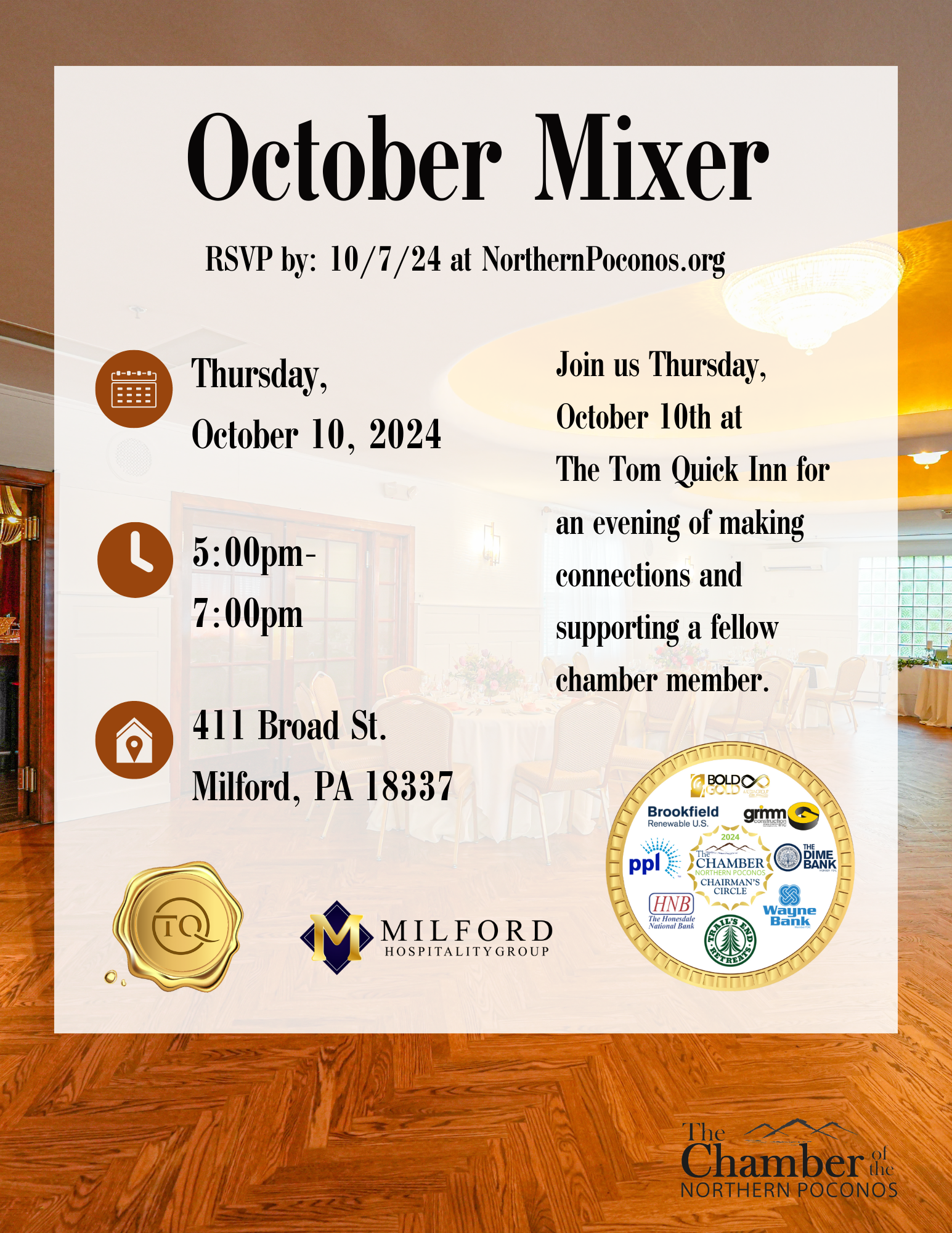 Join us Thursday, October 10th at the Tom Quick Inn for an evening of making connections and supporting a fellow chamber member. CASH BAR AVAILABLE