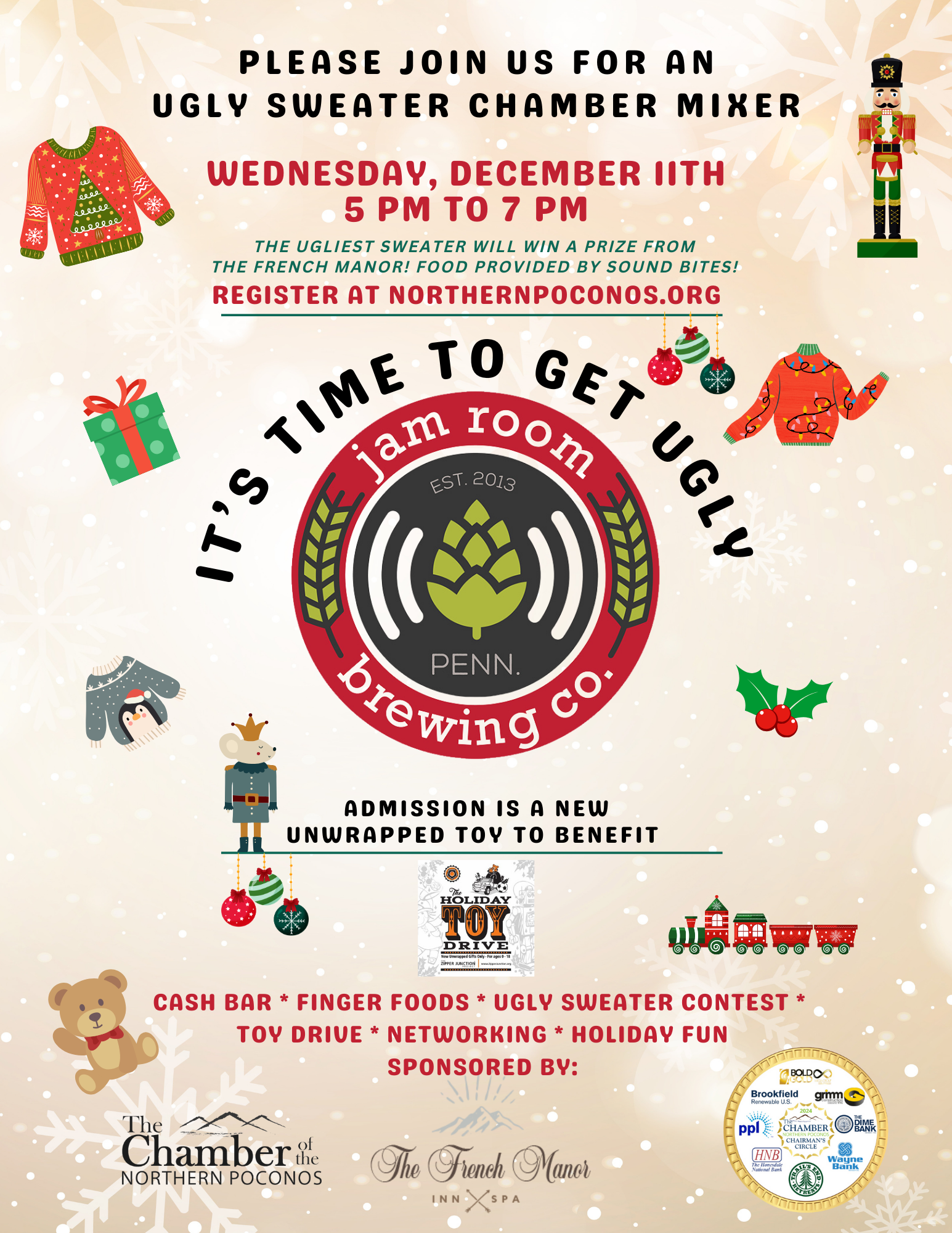 Join The Chamber of the Northern Poconos for a mixer on Wednesday, December 11th at Jam Room Brewing Company. Wear your ugly holiday sweater to be entered for the grand prize from The French Manor Inn & Spa! The cost of admission is new unwrapped toy to benefit the Holiday Toy Drive! Cash bar, Lite Fare provided by Sound Bites, Networking, Ugly Sweaters, Holiday Cheer!